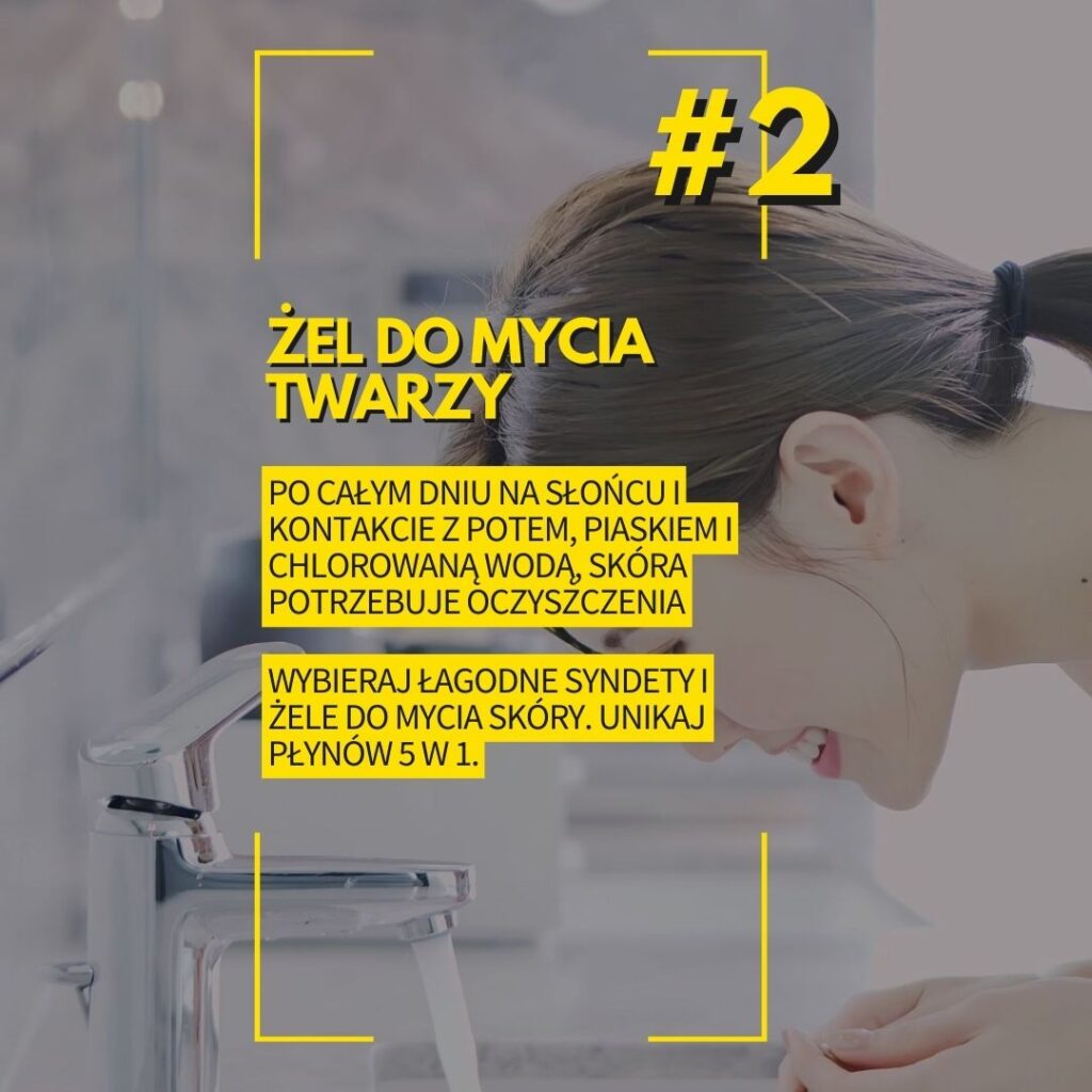 - Żel do mycia twarzy – usuwa pot, sól, filtry UV i zanieczyszczenia bez uszkadzania bariery naskórkowej. Wybieraj te przeznaczone do skóry suchej/atopowej.