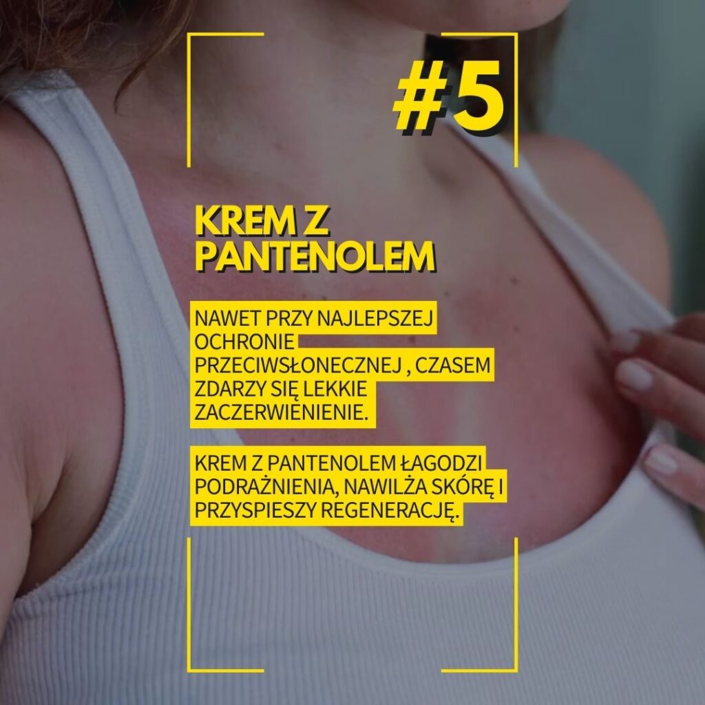 - Krem z pantenolem – działa kojąco, przyspiesza regenerację skóry po słońcu i podrażnieniach.